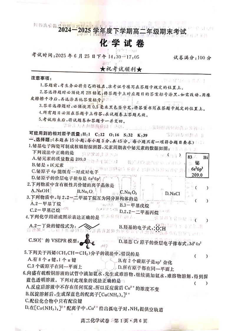 湖北省武汉市五校联合体2024-2025学年高二下学期6月期末化学