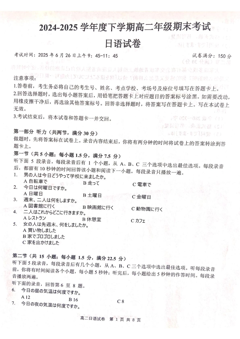 湖北省武汉市五校联合体2024-2025学年高二下学期6月期末日语