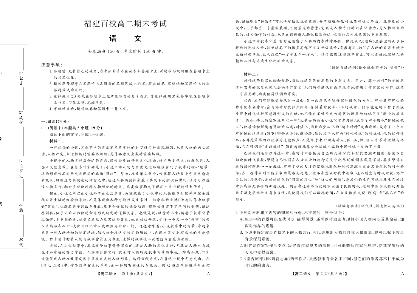 高二语文--福建省百校2024-2025学年高二下学期期末联考