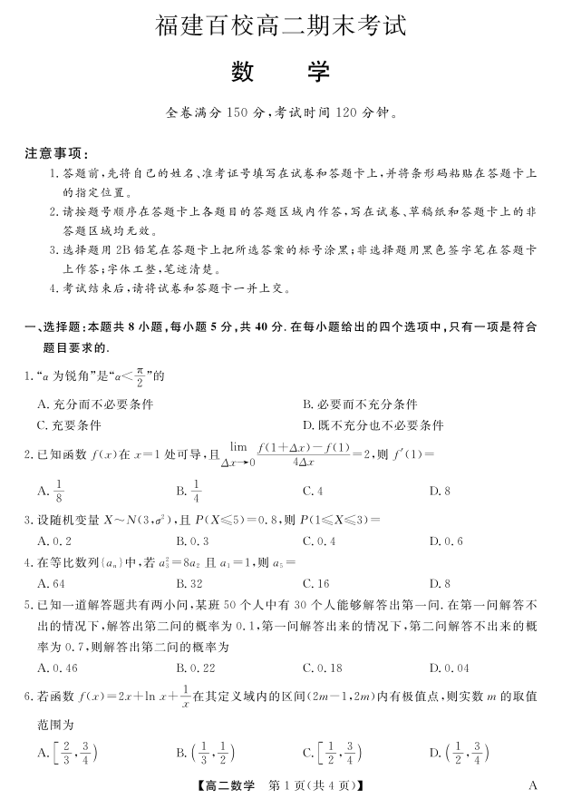 高二数学--福建省百校2024-2025学年高二下学期期末联考