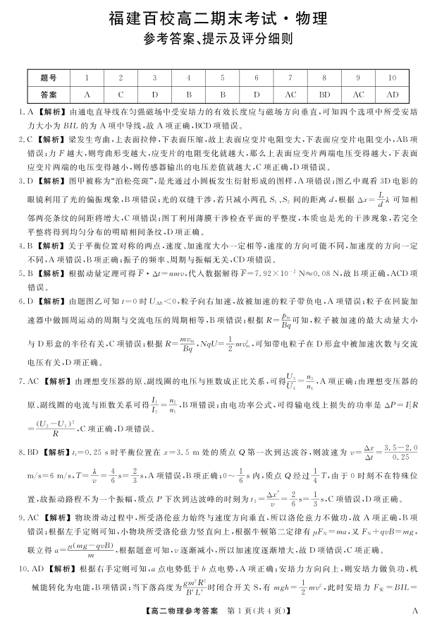 高二物理答案--福建省百校2024-2025学年高二下学期期末联考