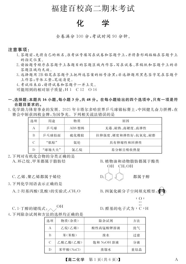 高二化学--福建省百校2024-2025学年高二下学期期末联考