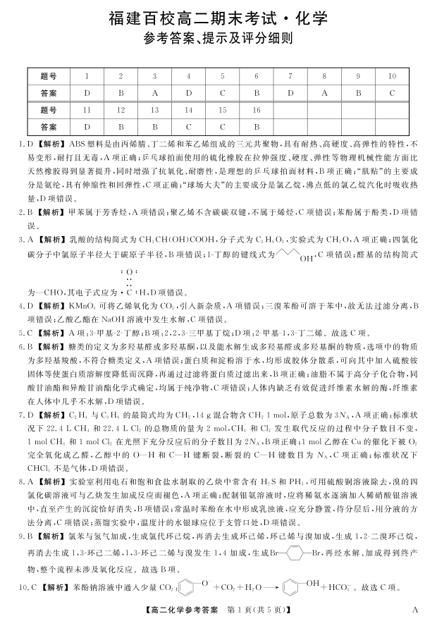 高二化学答案--福建省百校2024-2025学年高二下学期期末联考