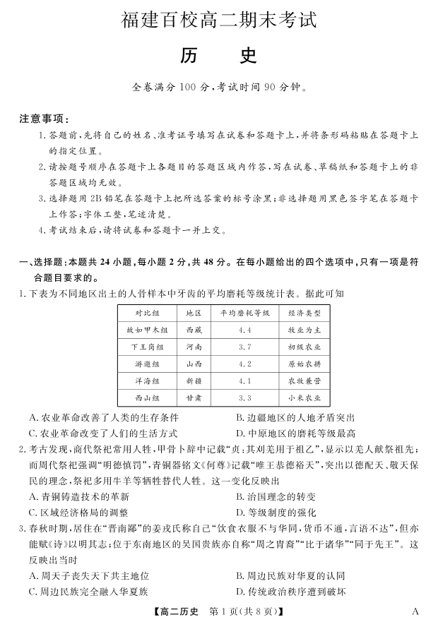 高二历史--福建省百校2024-2025学年高二下学期期末联考