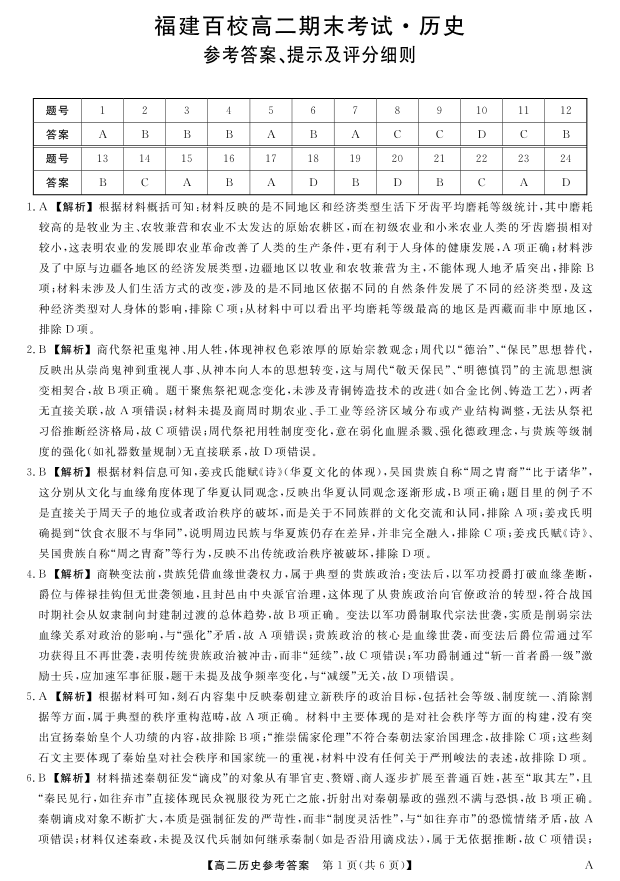 高二历史答案--福建省百校2024-2025学年高二下学期期末联考