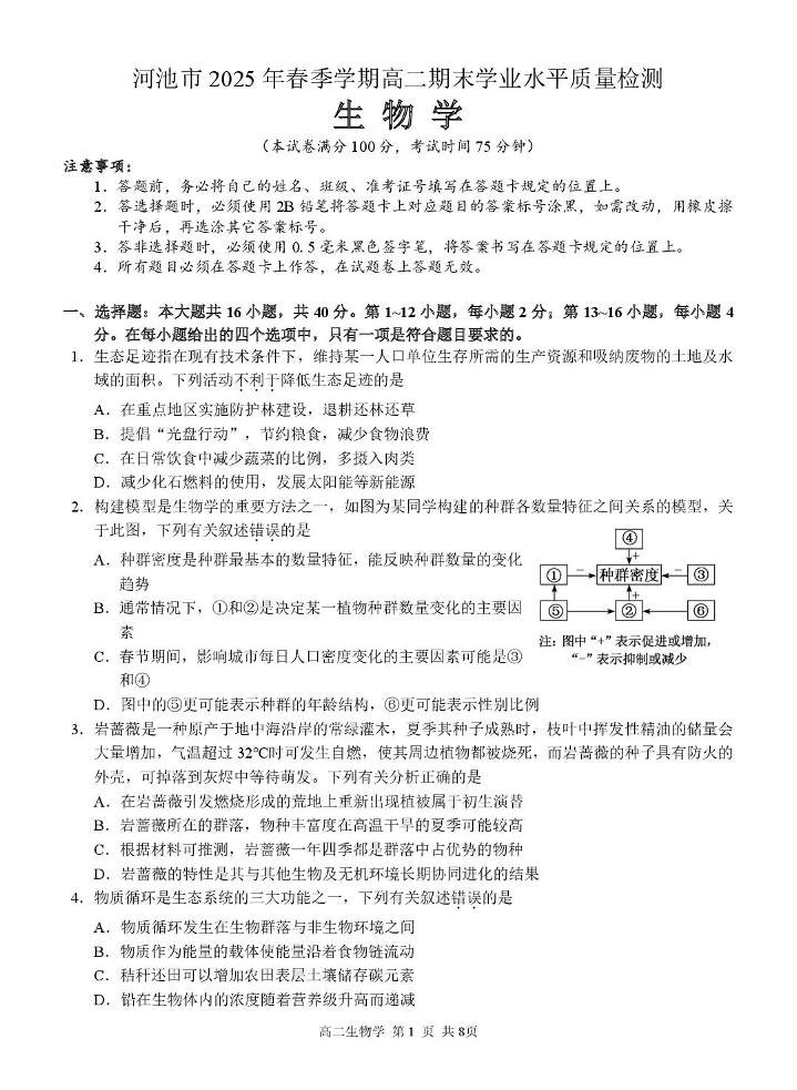 高二生物+答案--广西河池市2024-2025学年高二下学期7月期末考试