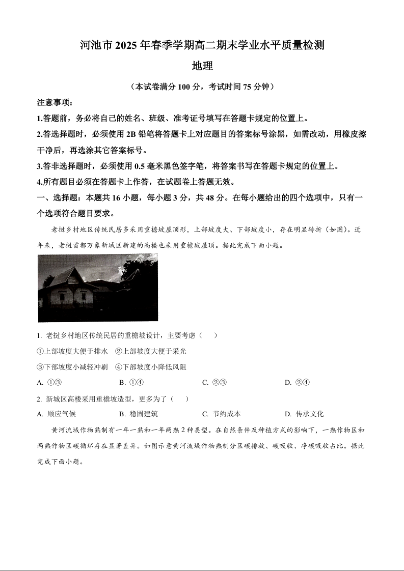 高二地理+答案--广西河池市2024-2025学年高二下学期7月期末考试