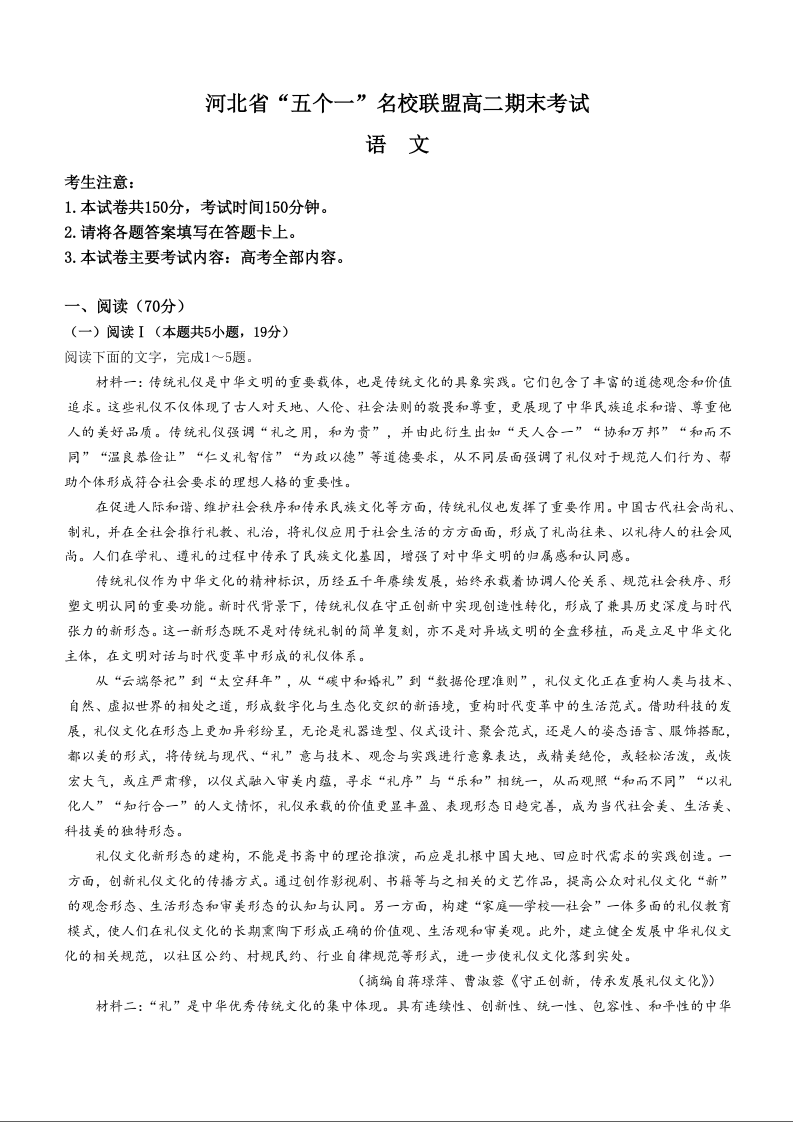 高二语文+答案--河北省“五个一”名校联盟2024-2025学年高二下学期7月期末