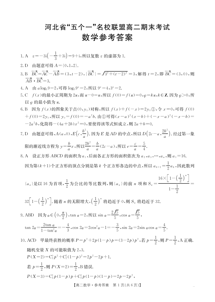 高二数学答案--河北省“五个一”名校联盟2024-2025学年高二下学期7月期末
