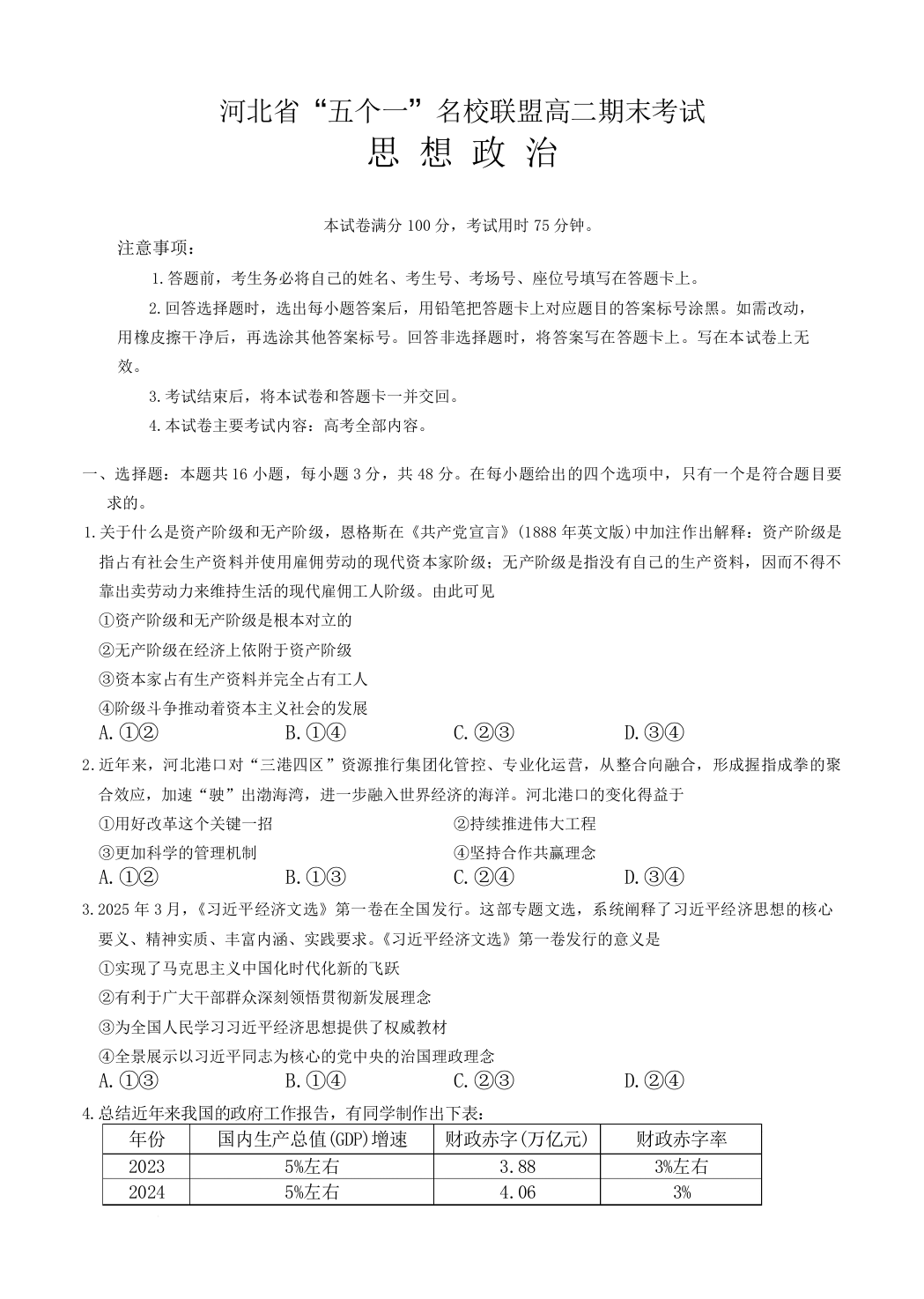高二政治+答案--河北省“五个一”名校联盟2024-2025学年高二下学期7月期末