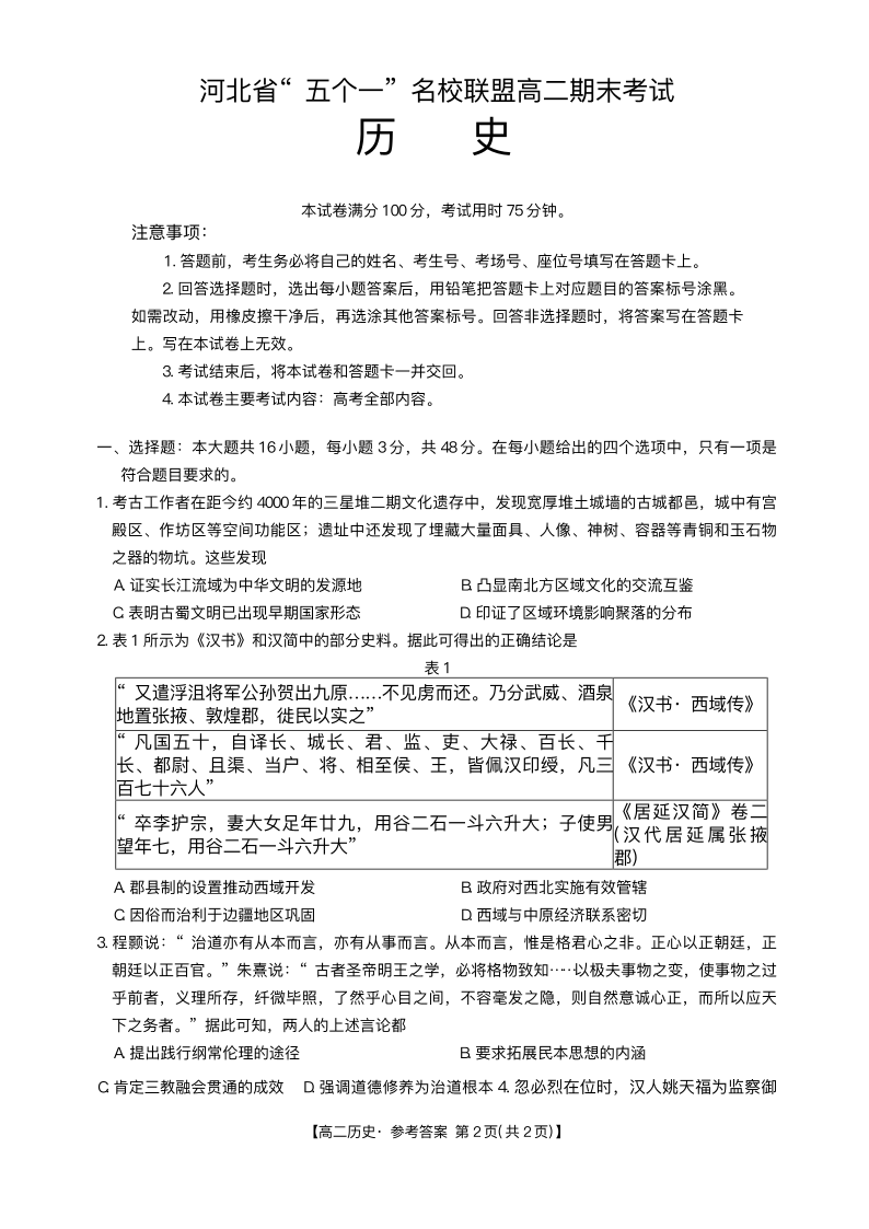 高二历史+答案--河北省“五个一”名校联盟2024-2025学年高二下学期7月期末