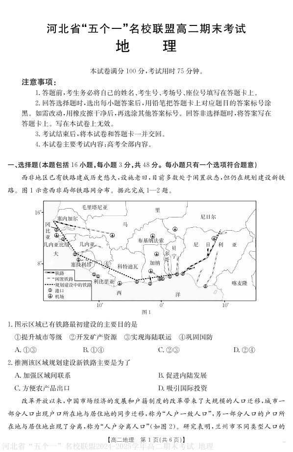 高二地理--河北省“五个一”名校联盟2024-2025学年高二下学期7月期末