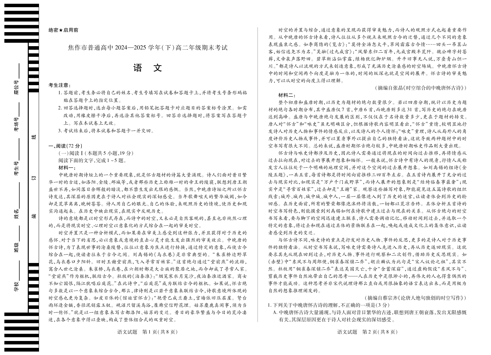 高二语文--河南省焦作市普通高中2024-2025学年高二年级期末考试