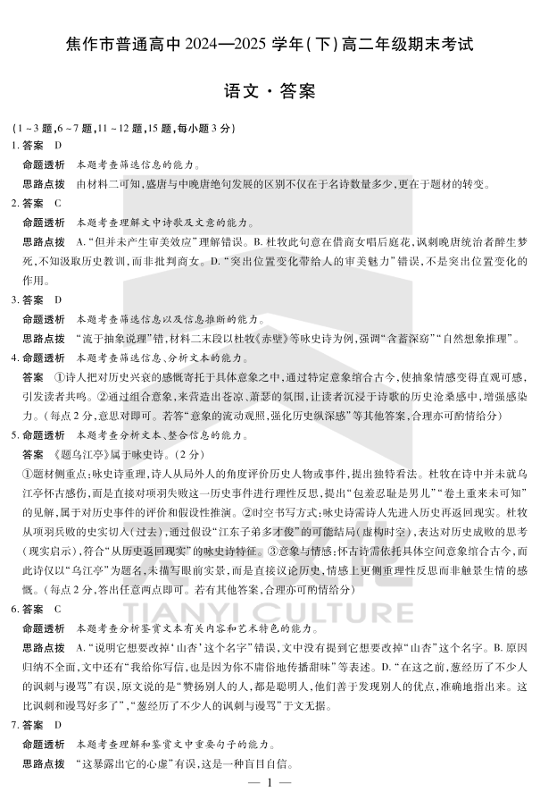 高二语文答案--河南省焦作市普通高中2024-2025学年高二年级期末考试