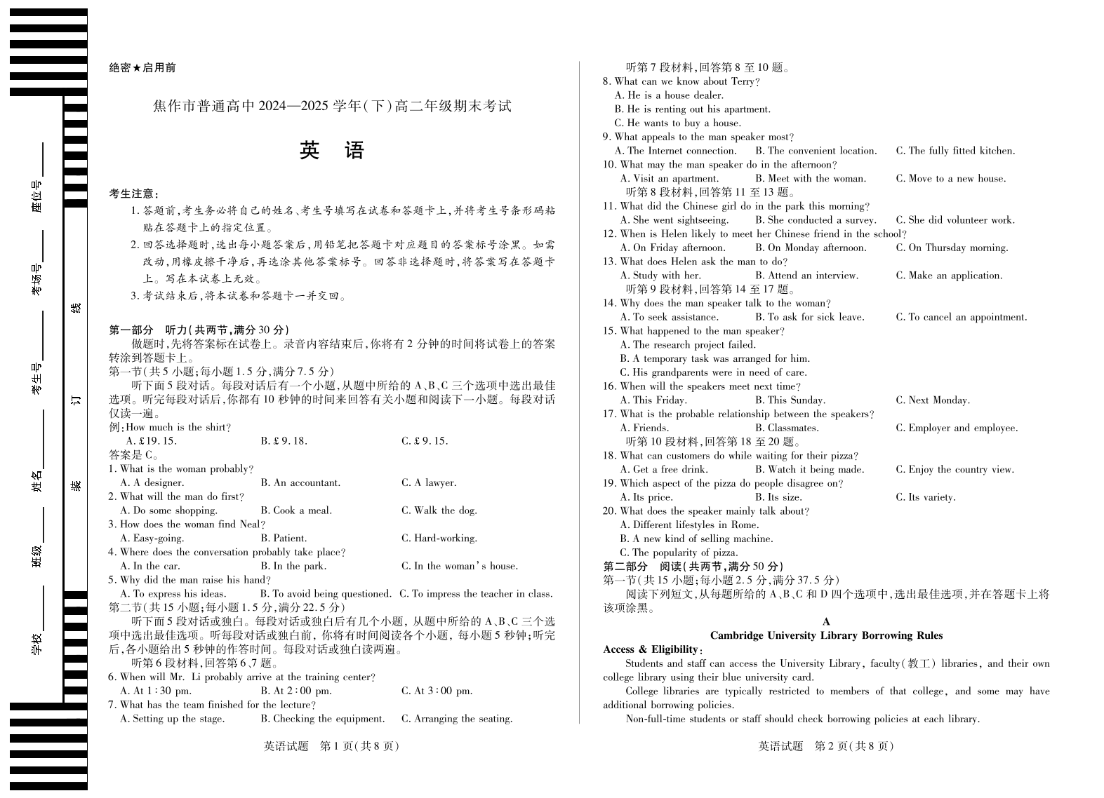 高二英语--河南省焦作市普通高中2024-2025学年高二年级期末考试