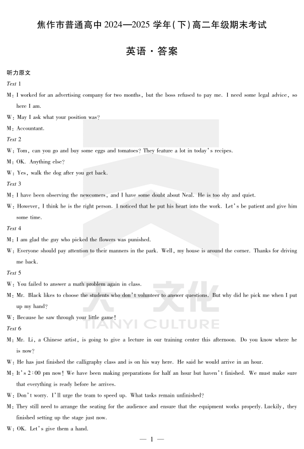 高二英语答案--河南省焦作市普通高中2024-2025学年高二年级期末考试