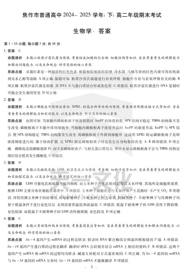 高二生物答案--河南省焦作市普通高中2024-2025学年高二年级期末考试