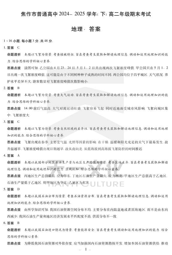 高二地理答案--河南省焦作市普通高中2024-2025学年高二年级期末考试