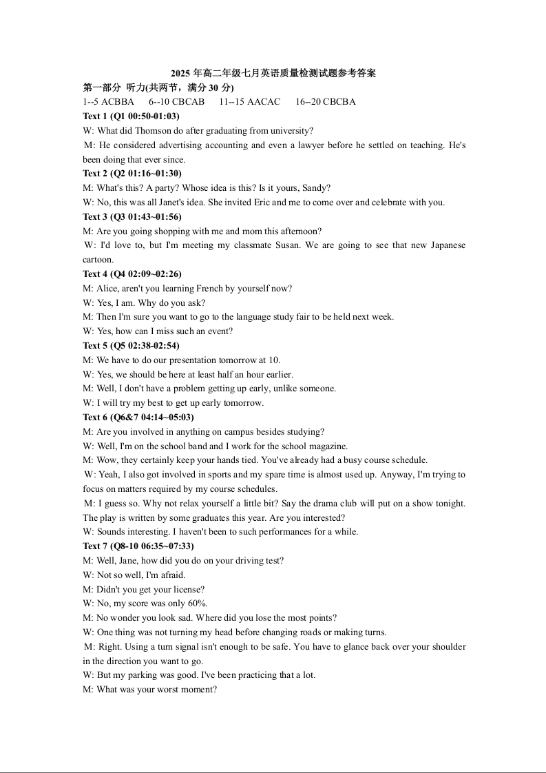 高二英语答案--湖北省黄石市2024-2025学年高二7月期末统一测试