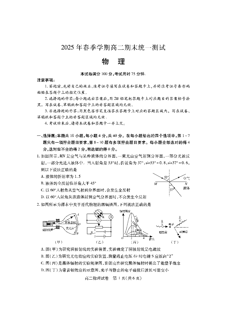 高二物理--湖北省黄石市2024-2025学年高二7月期末统一测试