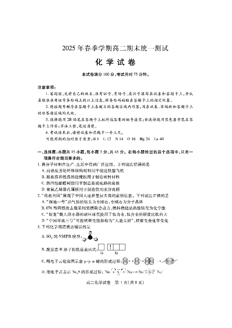 高二化学--湖北省黄石市2024-2025学年高二7月期末统一测试