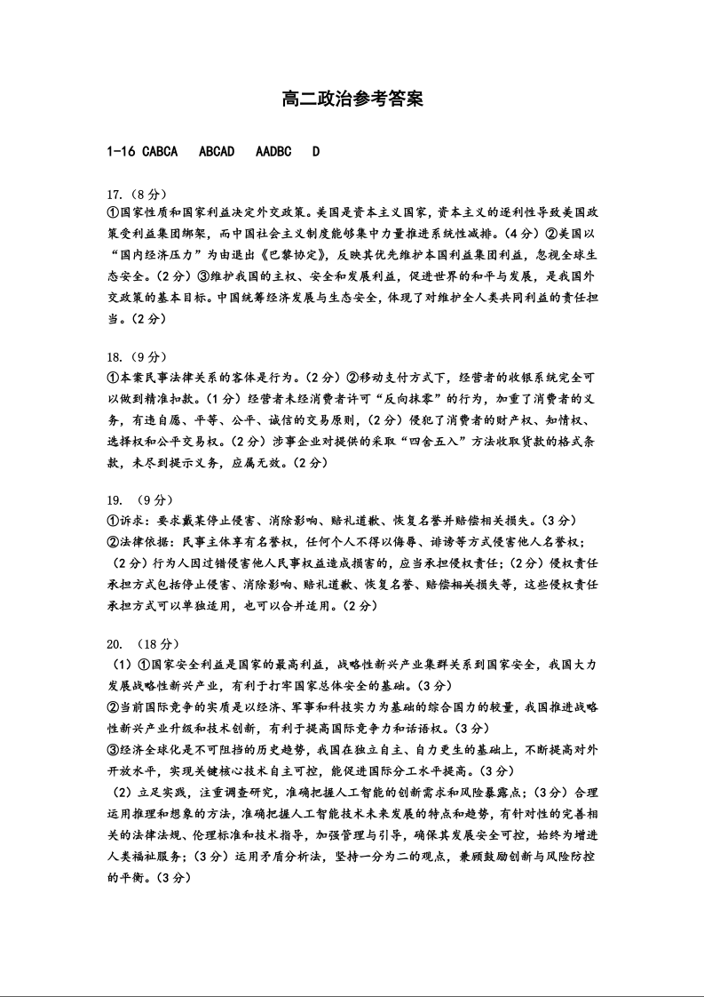 高二政治答案--湖北省黄石市2024-2025学年高二7月期末统一测试