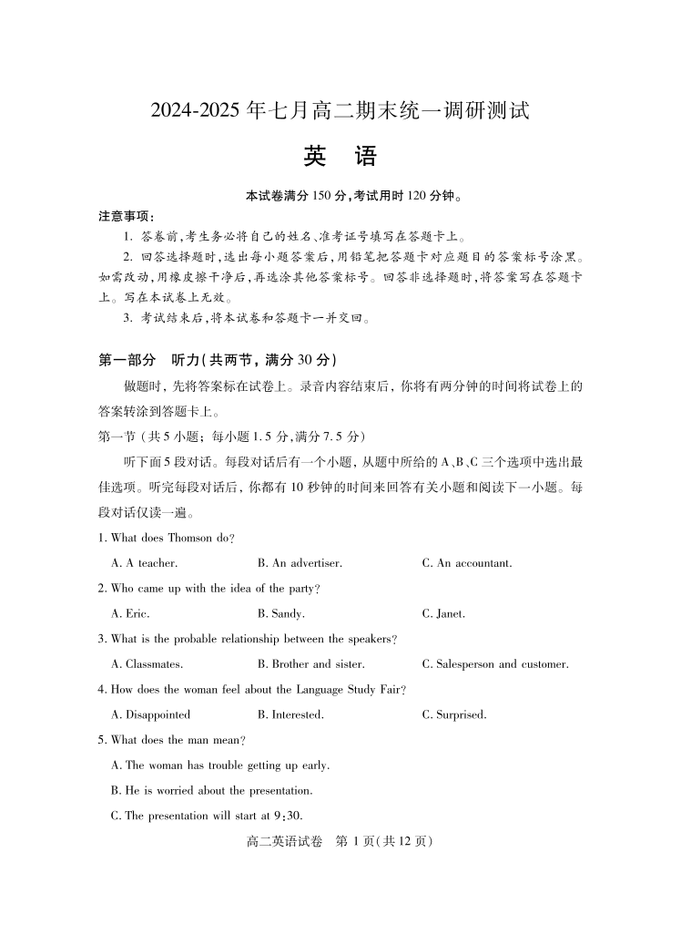 高二英语--湖北省潜江市2024-2025学年下学期高二7月期末检测