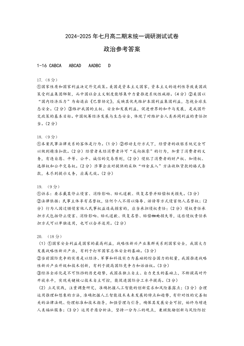 高二政治答案--湖北省潜江市2024-2025学年下学期高二7月期末检测