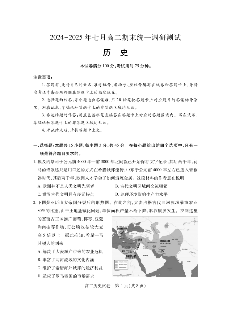 高二历史--湖北省潜江市2024-2025学年下学期高二7月期末检测