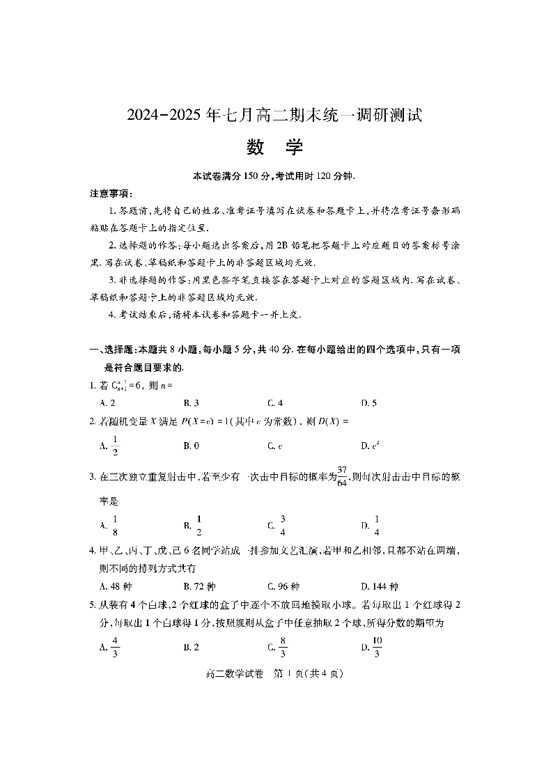 高二数学--湖北省天门市2024-2025学年高二7月期末统一调研测试