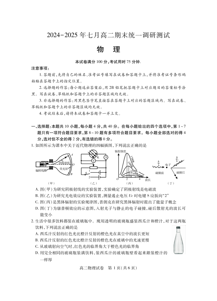 高二物理--湖北省天门市2024-2025学年高二7月期末统一调研测试