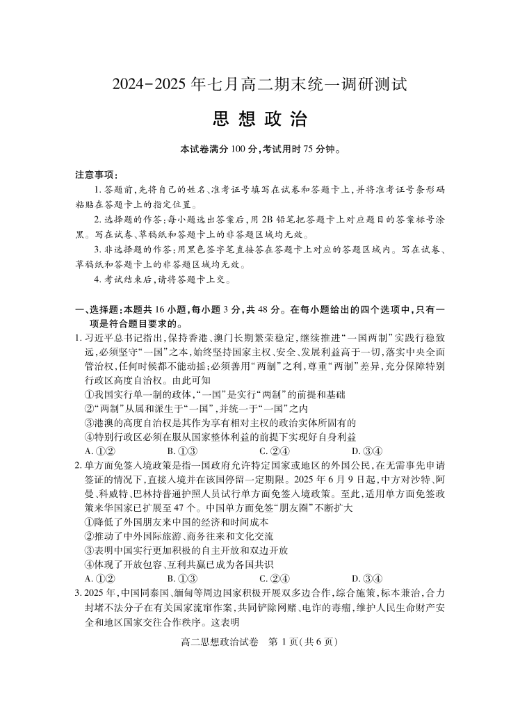高二政治--湖北省天门市2024-2025学年高二7月期末统一调研测试