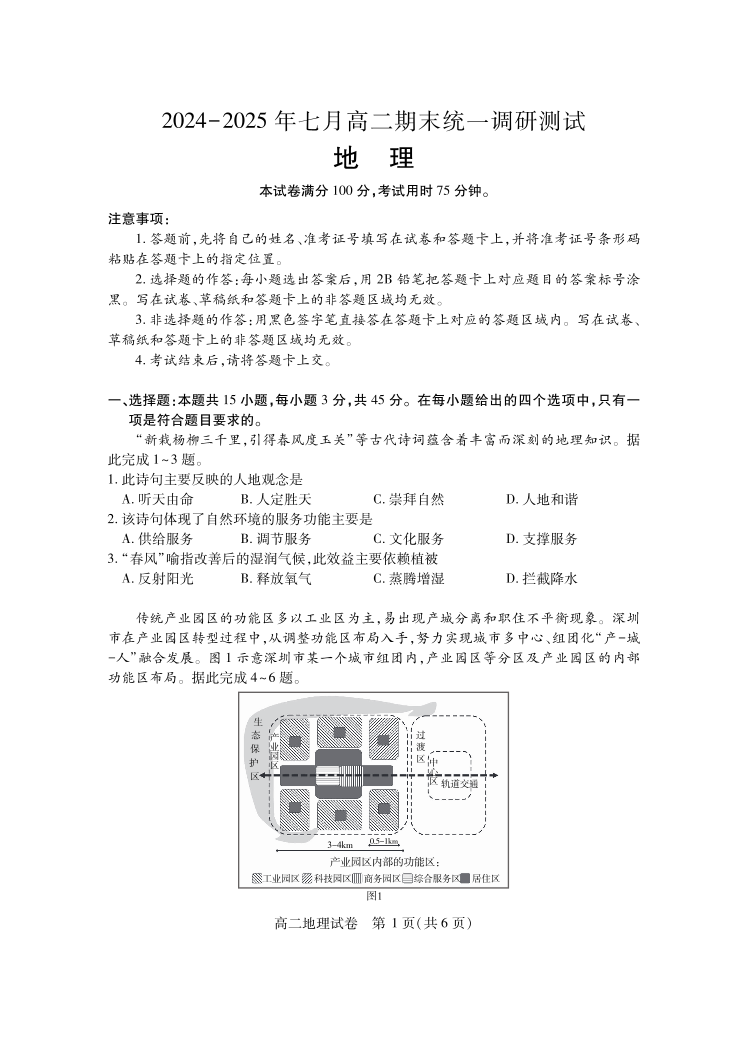 高二地理--湖北省天门市2024-2025学年高二7月期末统一调研测试