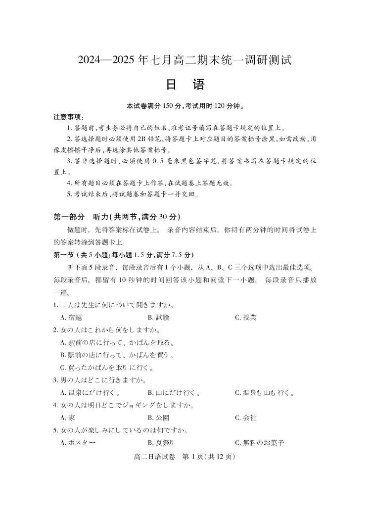 高二日语--湖北省天门市2024-2025学年高二7月期末统一调研测试