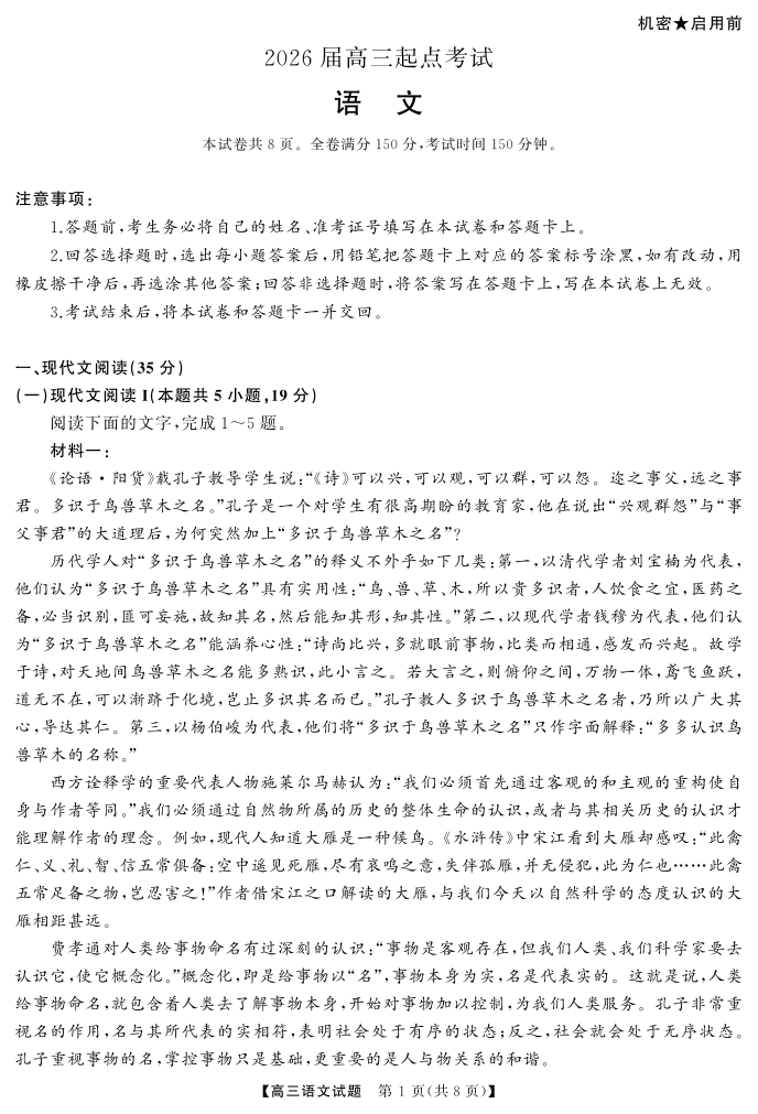 高二语文--湖南省天壹名校联盟2026届高三起点考试