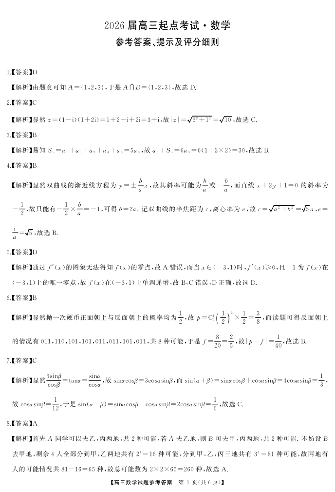 高二数学答案--湖南省天壹名校联盟2026届高三起点考试