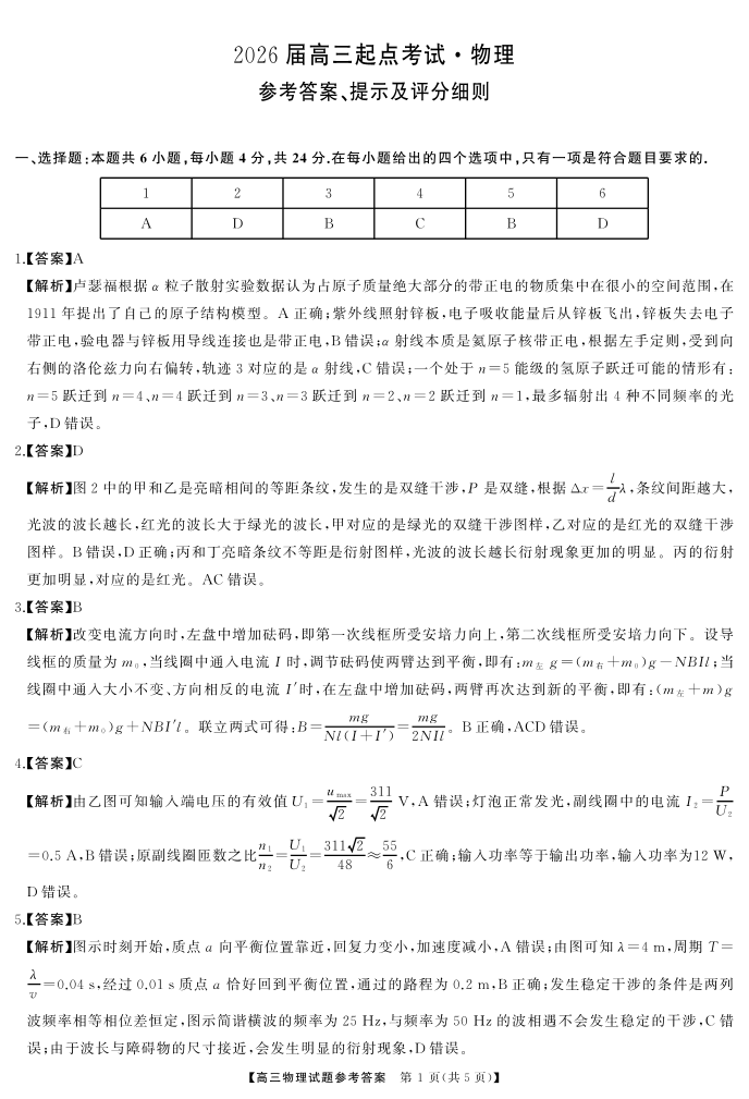 高二物理答案--湖南省天壹名校联盟2026届高三起点考试