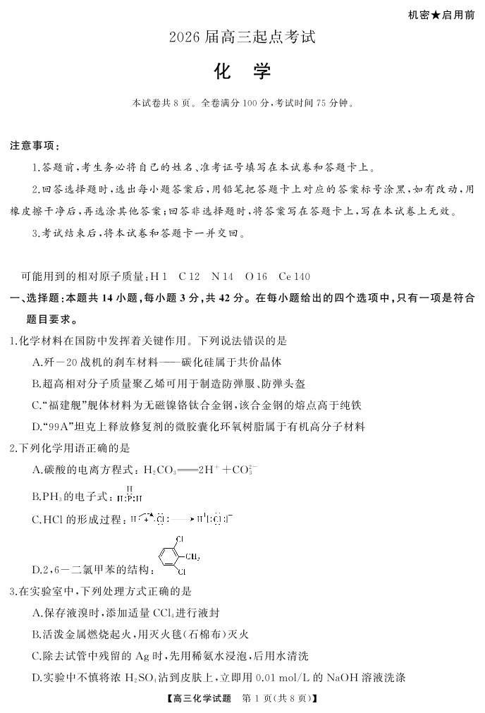 高二化学--湖南省天壹名校联盟2026届高三起点考试