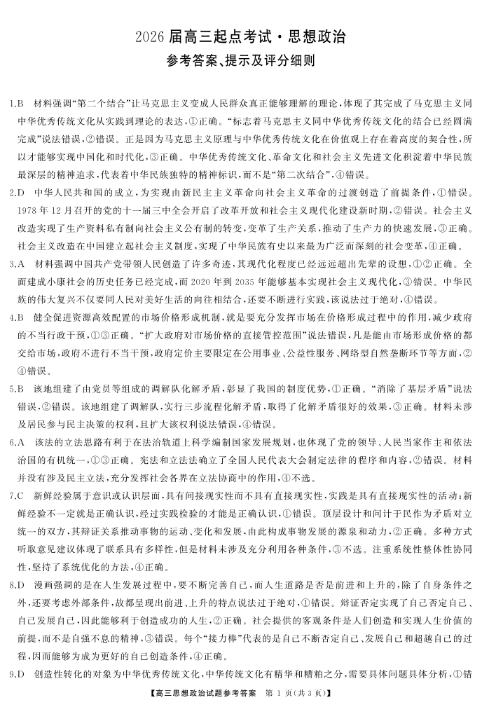 高二政治答案--湖南省天壹名校联盟2026届高三起点考试