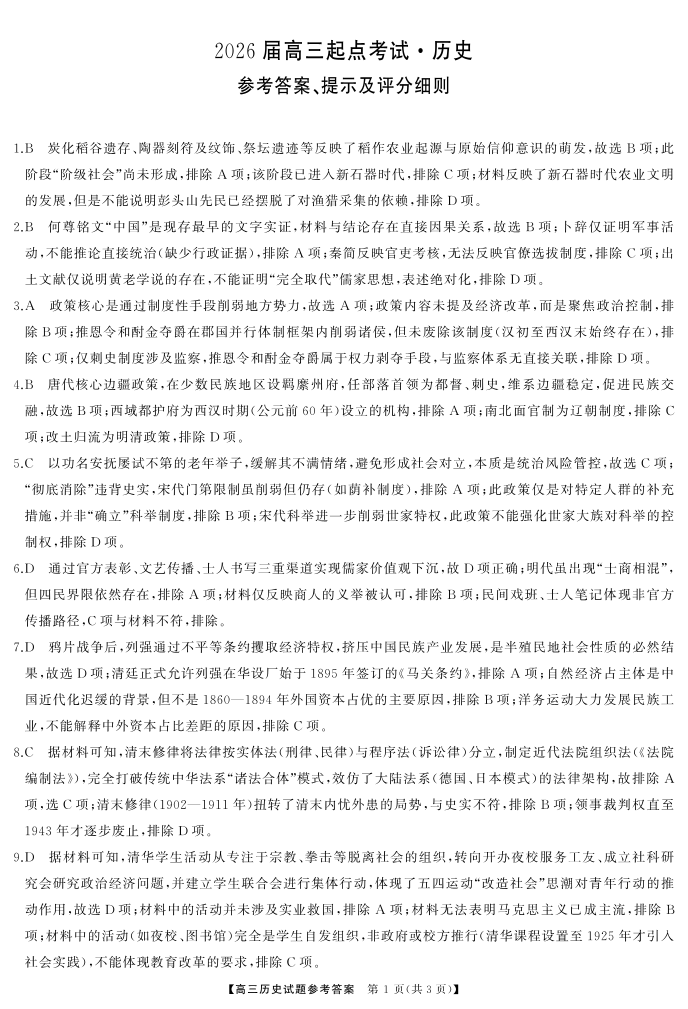 高二历史答案--湖南省天壹名校联盟2026届高三起点考试