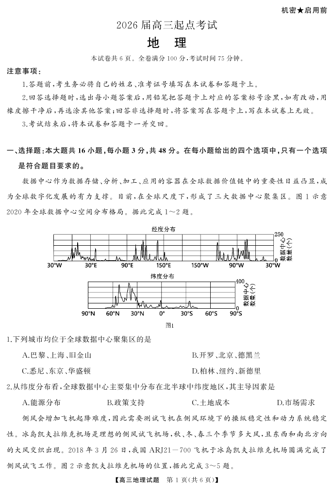 高二地理--湖南省天壹名校联盟2026届高三起点考试