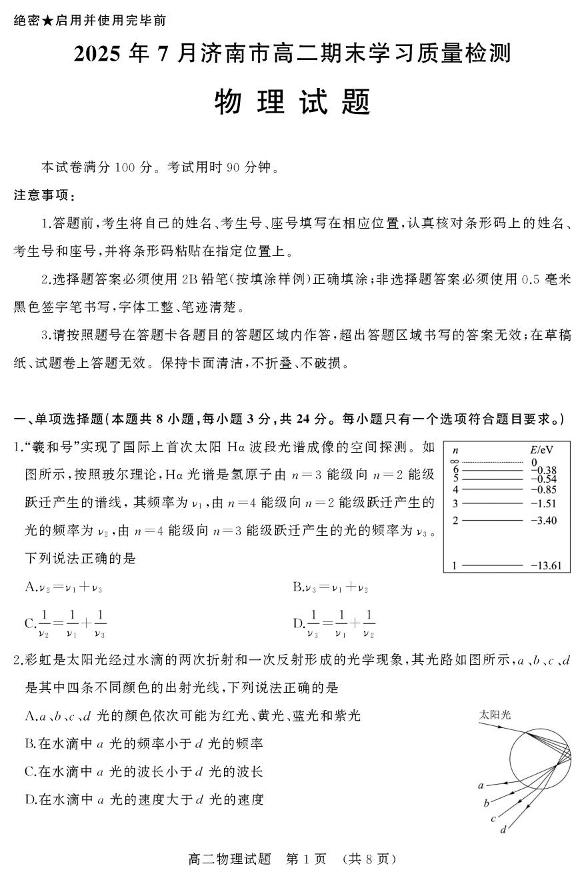 高二物理--山东省济南市2024-2025学年高二7月期末学习质量检测