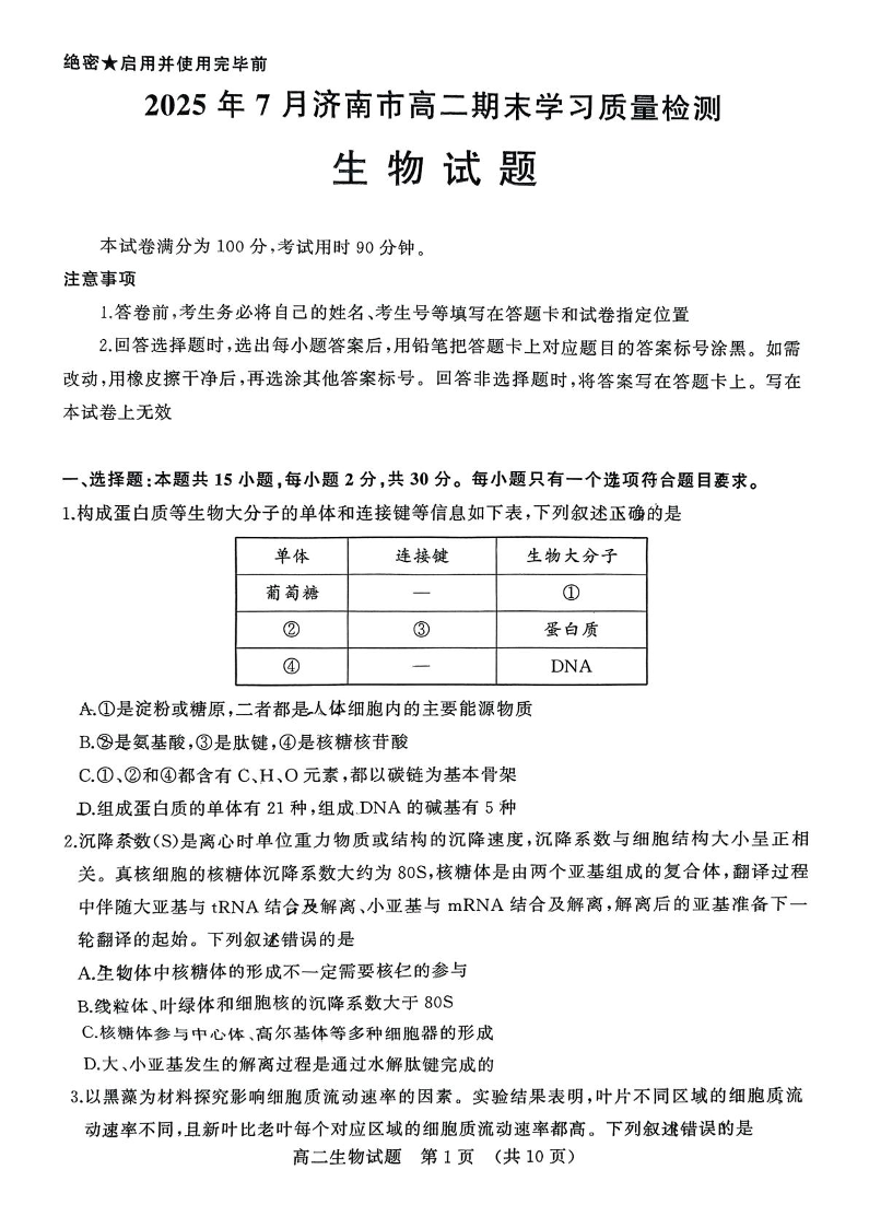 高二生物+答案--山东省济南市2024-2025学年高二7月期末学习质量检测