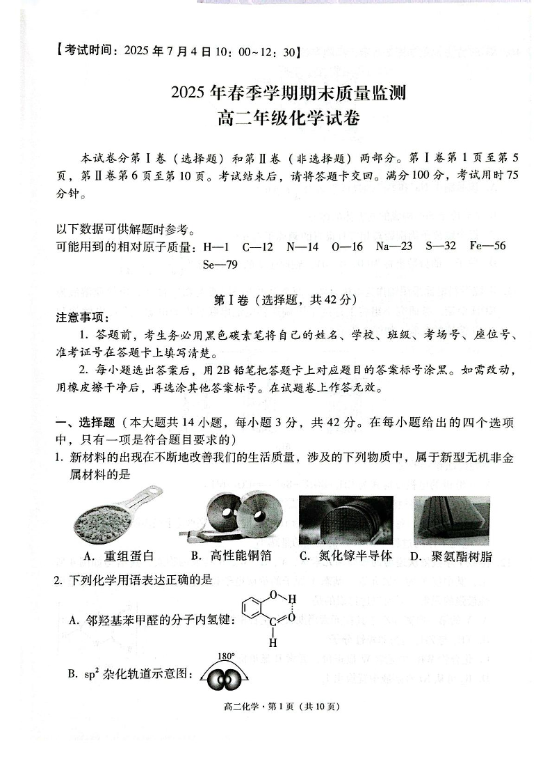 高二化学+答案--云南省保山市2024-2025学年高二下学期7月期末考试