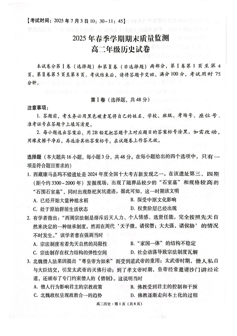 高二历史+答案--云南省保山市2024-2025学年高二下学期7月期末考试