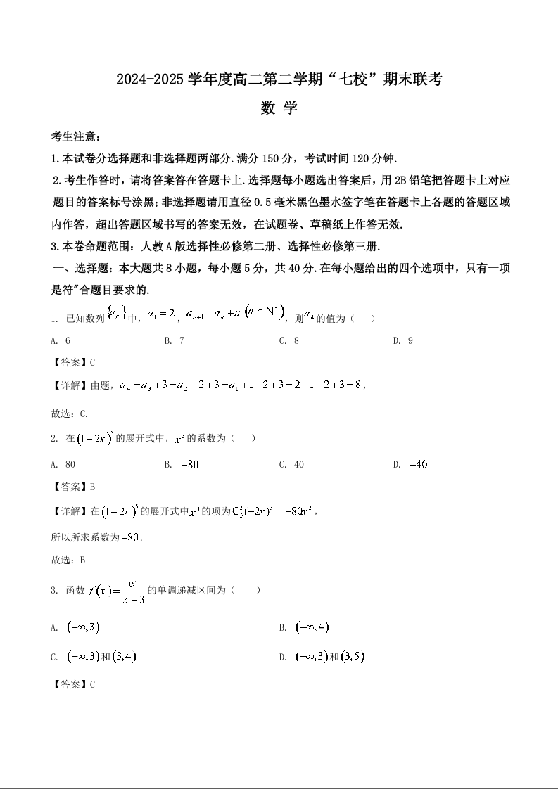 高二数学+答案--陕西省安康市七校2024-2025学年高二下学期7月期末联考