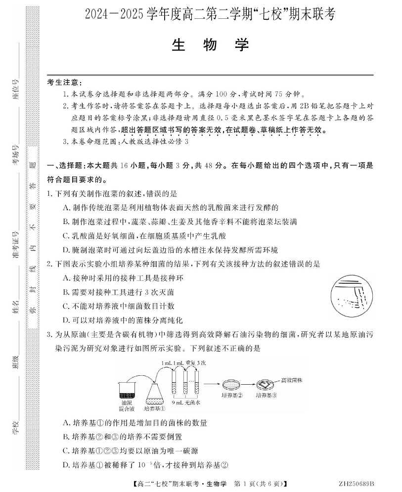 高二生物+答案--陕西省安康市七校2024-2025学年高二下学期7月期末联考