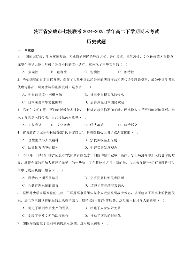 高二历史+答案--陕西省安康市七校2024-2025学年高二下学期7月期末联考
