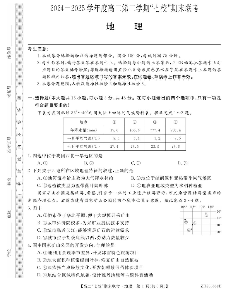 高二地理+答案--陕西省安康市七校2024-2025学年高二下学期7月期末联考