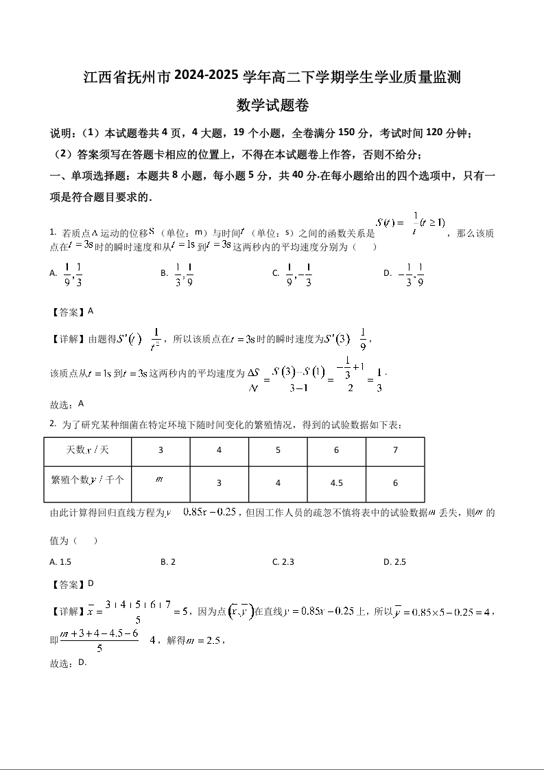 高二数学+答案--江西省抚州市2024-2025学年高二下学期期末考试